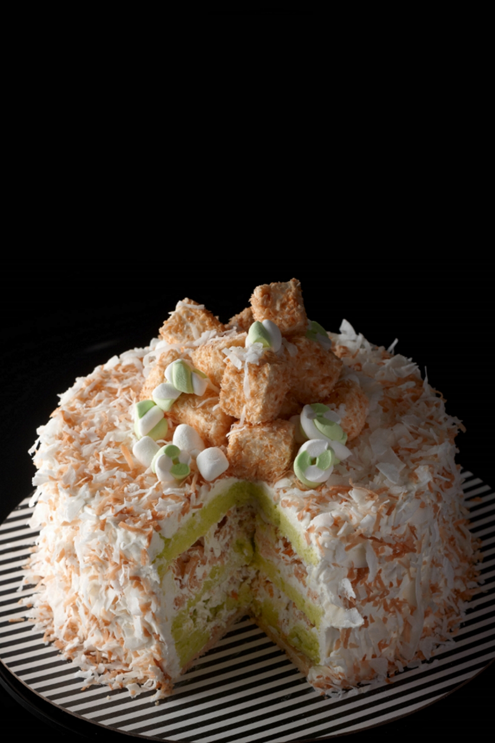 Pandan & Coconut Chiffon Cream Cake, White Choc Cornflake Crunch topped with Marshmallow and a Handcrafted Sugar Art Orchid